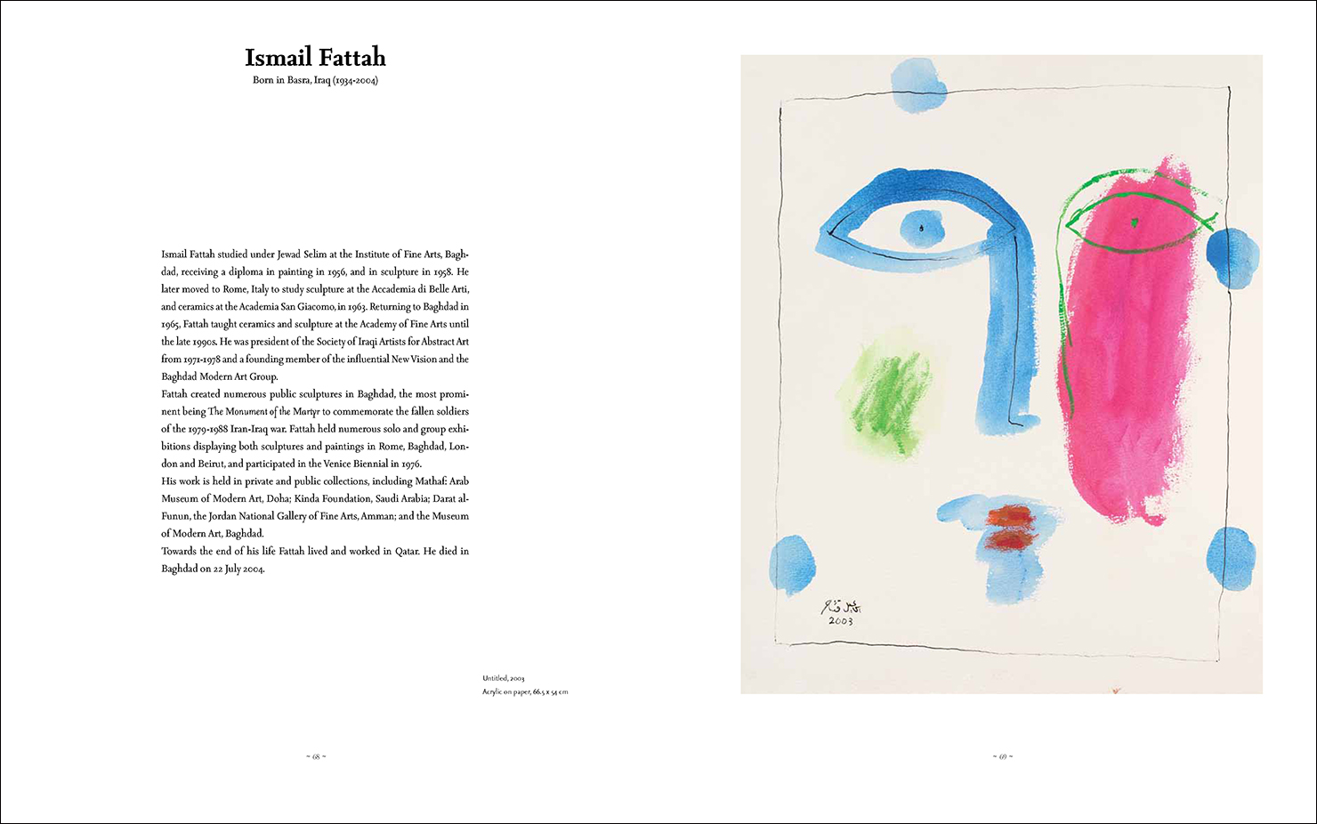The artists in the collection and presented in this book are: Shafic Abboud, Nasr Abdul Aziz, Nawal Abdullah, Adonis, Himat Mohammed Ali, Rajwa Ali, Hani Alqam, Mohammad Al-Ameri, Jamal Ashour, Dia Azzawi, Khaled Barakeh, Kamal Boullata, Ghada Dahdaleh, Mohanna Durra, Ismail Fattah, Riham Ghassib, Ghassan Ghayeb, Samia Halaby, Wijdan Al-Hashemi, Samer Usama Hatam, Saadi Al-Kaabi, Halim Al-Karim, Farouk Kaspaules, Ammar Khammash, Khalid Khreis, Sadik Kwaish Alfraji, Houssein Madi, Fouad Mimi, Rafa Al-Nasiri, Mohammad Nasrallah, Juman Nimri, Said Nuseibeh, Mahmoud Obaidi, Nuha Al-Radi, Khalil Raian, Kareem Risan, Shaker Hassan Al-Said, Diana Shamounki, Nabil Shehadeh, Rula Shukairy, Samer Tabbaa, Mahmoud Taha, Madiha Umar, Nazar Yahya.