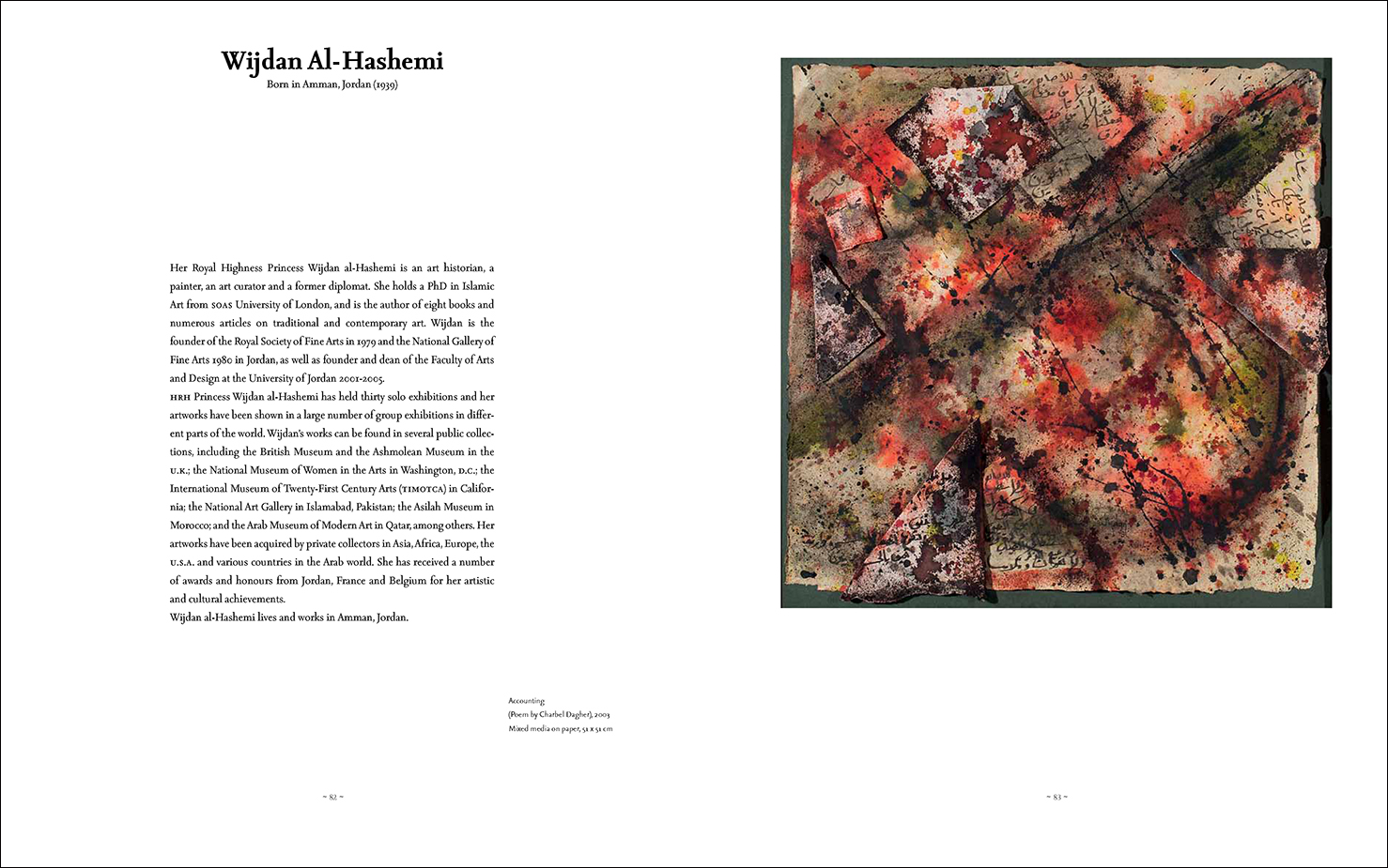 With texts by Majida Mouasher; HRH Princess Wijdan al-Hashemi PhD (painter and founder and president of the Royal Society of Fine Arts, Amman, Jordan); Nada Shabout PhD (Professor of Art History and Director of the Contemporary Arab and Muslim Studies Institute at the University of North Texas) and Dr. Luitgard Mols.